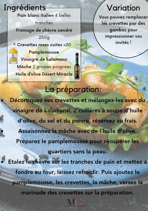 Recette bruschetta aux crevettes, pamplemousse et chèvre visibility402 Vues 15/05/2024 comment0 Commentaires list In: Les idées cuisine Dans cette recette nous utilisons: - Notre huile Desert Miracle - Notre vinaigre à la pulpe de kalamansi DESERT MIRACLE BIO - 500ml Certifiée Bio. Première pression à froid Aucune amertume... Prix 20,00 € Ajouter au panier KALAMANSI 100 % naturel, sans arômes, sans colorants et sans... Prix 11,50 € Ajouter au panier VINAIGRE DE KALAMANSI Un parfait petit cadeau de table ! Un format dégustation sur... Prix 7,00 € Ajouter au panier Liker Facebook Twitter Pinterest LinkedIn Tumblr Laisser un commentaire Veuillez notez que les commentaires doivent être approuvés avant d'être publiés Poster un commentaire Dimanche Lundi Mardi Mercredi Jeudi Vendredi Samedi Janvier Fevrier Mars Avril Mai Juin Juillet Août Septembre Octobre Novembre Décembre