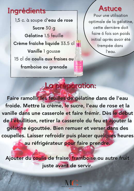 Recette panna Cotta à l'eau de rose visibility436 Vues 16/05/2024 comment0 Commentaires list In: Les idées cuisine Dans cette recette nous utilisons : - Notre eau de rose Eau de rose Eau de Rose TERGA Obtenue par distillation de pétales de... Prix 9,90 € Ajouter au panier MIGNONNETTE EAU DE ROSE Un parfait petit cadeau de table ! Un format dégustation sur... Prix 6,00 € Ajouter au panier Liker Facebook Twitter Pinterest LinkedIn Tumblr Laisser un commentaire Veuillez notez que les commentaires doivent être approuvés avant d'être publiés Poster un commentaire Dimanche Lundi Mardi Mercredi Jeudi Vendredi Samedi Janvier Fevrier Mars Avril Mai Juin Juillet Août Septembre Octobre Novembre Décembre